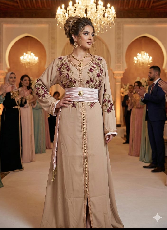 قفطان أنيق بلون بيج راقٍ مع تطريز وردي وذهبي فخم يعطي مظهراً أنثوياً راقياً.