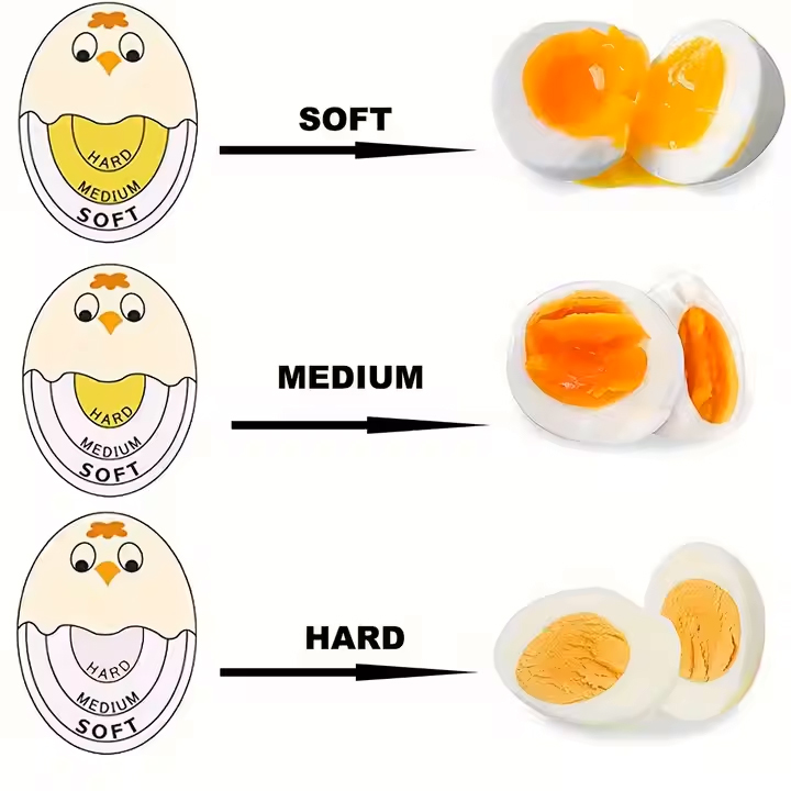 دقة متناهية بفضل تغير الألوان: وداعاً للتخمين!يعمل هذا المؤقت الثوري بتقنية حساسة للحرارة تتغير ألوانه تدريجياً من الخارج إلى الداخل، تماماً مثل البيضة الحقيقية! يُشير تغير اللون بوضوح إلى مراحل نضج البيض المختلفة: من النيئ، إلى السائل (Soft)، ثم متوسط النضج (Medium)، وصولاً إلى الصلب (Hard). اختر درجتك المفضلة بكل سهولة ودقة.