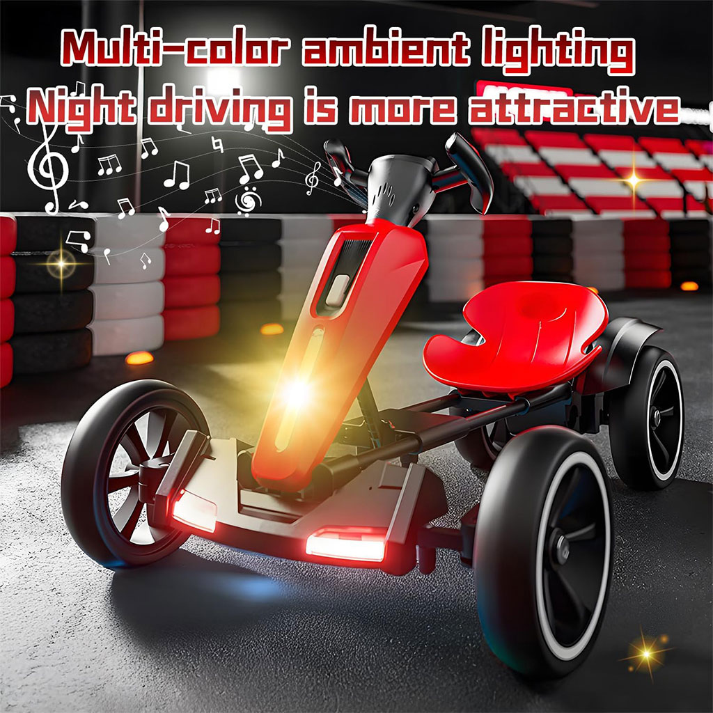 بفضل أضواء LED الساطعة، يوفر الكارت تجربة قيادة ممتعة وآمنة في المساء. الإضاءة تضيف لمسة جمالية وتفاعلية، ويمكن التحكم بها بسهولة من خلال المقود، ما يزيد من حماس الأطفال أثناء القيادة.